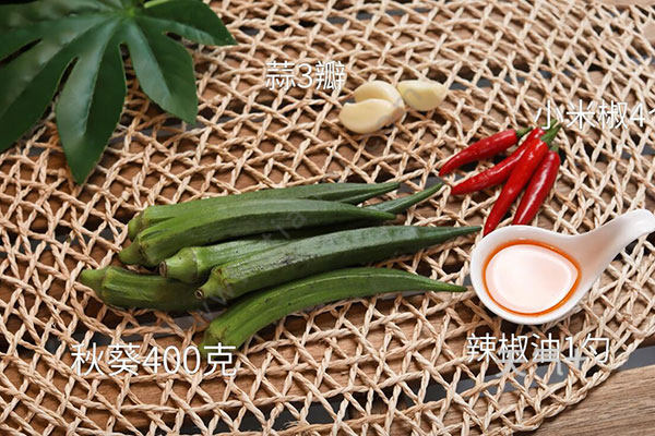 秋葵400克,辣椒油1勺,蒜3瓣,小米椒4个;