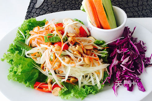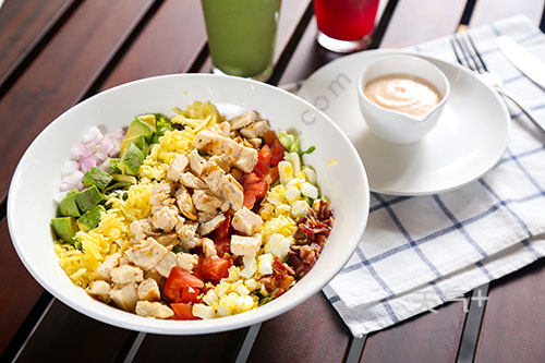 半杯胡萝卜汁,2汤匙乳酪,1汤匙菜籽油,香煎三文鱼,口蘑蔬菜沙拉