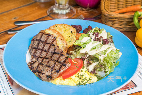 200克牛排,1/4杯干酪,半个蜜桔,2汤匙切碎的核桃,1勺半乳清蛋白