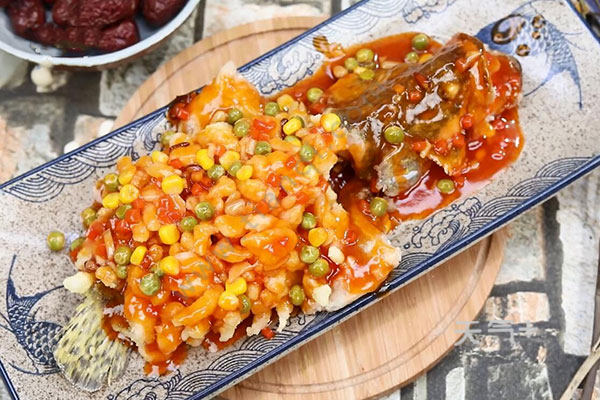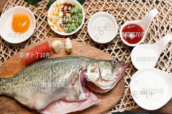 蒜切末,桂鱼洗净处理好,加鸡蛋黄、盐,裹上淀粉,碗中放白糖、白醋、盐拌匀,油温烧至6成热,提着头部、尾部放入锅内炸制,提着尾部炸30秒,放鱼头、鱼肉炸3分钟捞出,留底油,放蒜末炒香,放胡萝卜、玉米、豌豆炒至断生,加番茄酱、松子仁炒匀,倒糖醋汁、清水熬至浓稠,加油拌匀淋在炸好的鱼上。