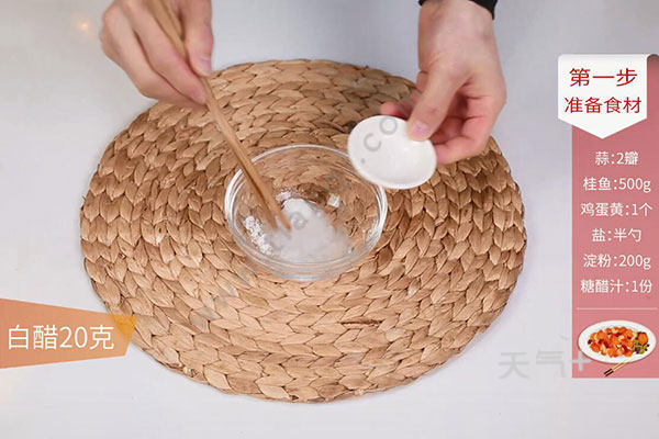 2.碗中放入白糖30克、白醋20克、盐半勺拌匀成糖醋汁;