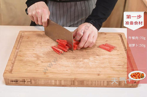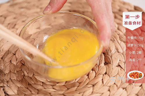1.午餐肉切粒,胡萝卜切粒。小葱2根切葱花;