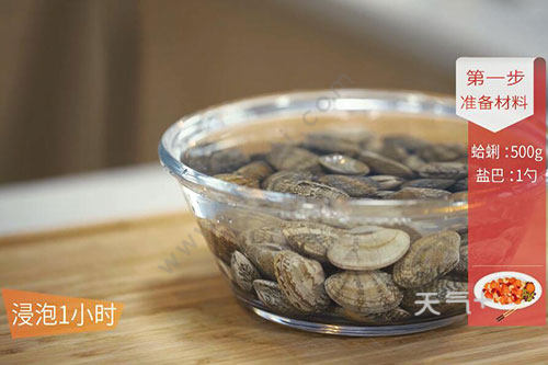 1.蛤蜊放入淡盐水中浸泡1小时后洗净(烹饪小技巧:蛤蜊提前放入淡盐水中浸泡、直至吐尽泥沙);