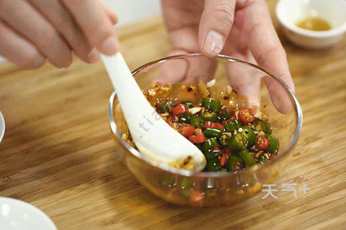4.碗中放入盐半勺、鸡精半勺、生抽1勺、醋半勺、辣椒油1勺、切好的杭椒、小米椒、蒜末成酱汁;