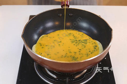 2.锅中放入少许油,舀一勺面糊倒入锅中,中小火煎制,在蛋饼未成型前,以缓慢的速度慢慢的转动锅底,形成圆形;