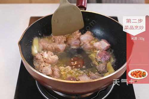 3.锅中放入适量油,油温烧至7成热,放入姜片、羊肉中火煸炒出油。倒入米酒50克继续炒。倒入适量清水煮1分钟后捞出。将甘草3克 小茴香3克 香叶3片,放入纱布包中封好;