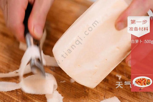 1.白萝卜洗净去皮,擦成细丝,放入少许盐,用手揉搓并放置一会儿(萝卜出水后变软,但出的水并不要倒掉哦);