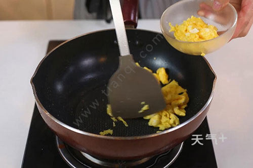 4.锅中放入适量油,油温烧至5成热,倒入蛋液快速滑熟,盛出待用;