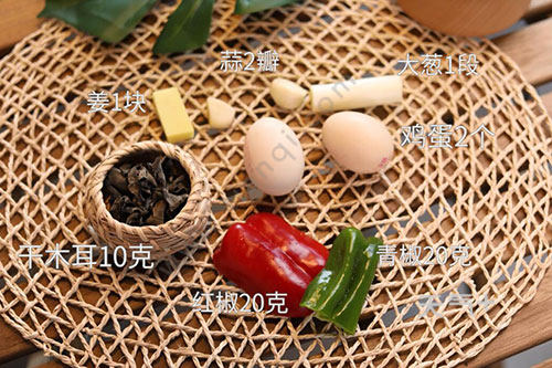 1.将木耳放入温水中泡发,去蒂摘小朵,青红椒切菱形片,葱姜蒜切片。