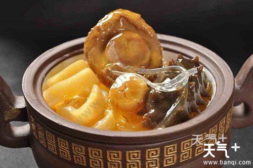佛跳墙是一道有名闽菜,其原料有鸡肉、鸭肉、鲍鱼、鸭掌、海参、干贝等,三十多种原料分别加工调制后,分层装进绍兴酒坛,用旺火烧沸,再用微火煨五六个小时。关于佛跳墙的来历,还真不是一个传说能讲完的。
