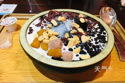 6.这时可以加入煮好的杂豆,淋上蜂蜜,也可以加入鲜奶,最后淋一勺炼奶即可。