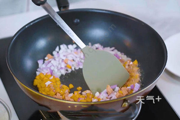 2.再把土豆去皮洗净,切厚片,放入锅中蒸20分钟,用勺子将蒸好的土豆压碎接着在锅中放入适量油,油温烧至6成热,放入火腿肠、胡萝卜、洋葱丁翻炒片刻。
