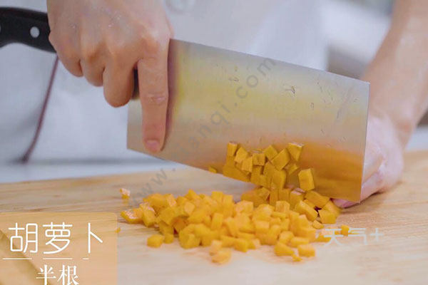 1.先把火腿肠、洋葱、胡萝卜切小丁、小葱2根切葱花。