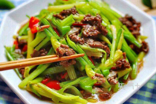 3.热油锅把西芹下锅炝炒至5成熟,取出待用;