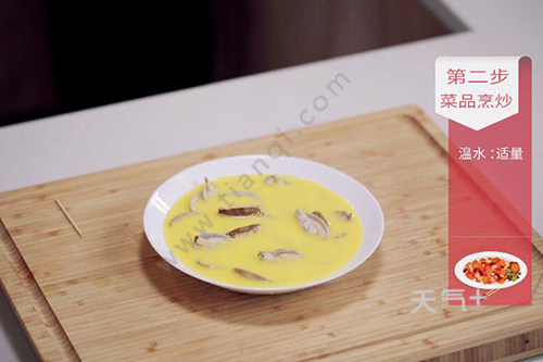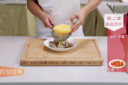 6.蛋液倒入装有花蛤的盘中;