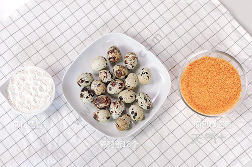 鹌鹑蛋18个,面粉适量,面包糠适量;