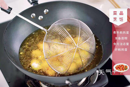 5.锅中放入适量油,油温烧至7成热,依次放入鹌鹑蛋炸至金黄,盛出装盘;