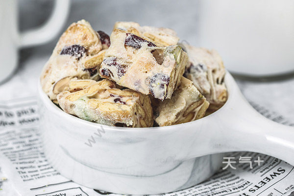 准备一个不粘锅,加黄油加热至融化,再加入棉花糖搅拌。怎么做雪花酥 雪花酥做法棉花糖融化后,再加奶粉拌匀,关火。将蔓越莓和坚果倒入锅中,加饼干拌匀,倒入一个平底的方形盘子里。按压成规则的方形,撒上奶粉,放置40分钟,晾凉。放凉后,将雪花酥切成块即可。