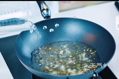 3.锅中放入适量油,油温烧至6成热,放入姜蒜末炒香,然后加入适量清水烧开;