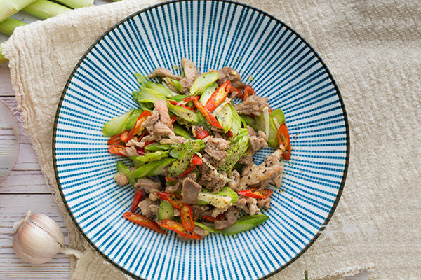 里脊肉洗干净,切成块,芦笋2根斜切成段,红椒斜切成片。锅里刷上一层油,放入里脊肉炒至变色,加入少许料酒,煸炒半分钟。再倒入芦笋段和红椒一起翻炒。炒至断生后,调入盐适量,翻炒均匀,装盘,撒黑胡椒粒即可。