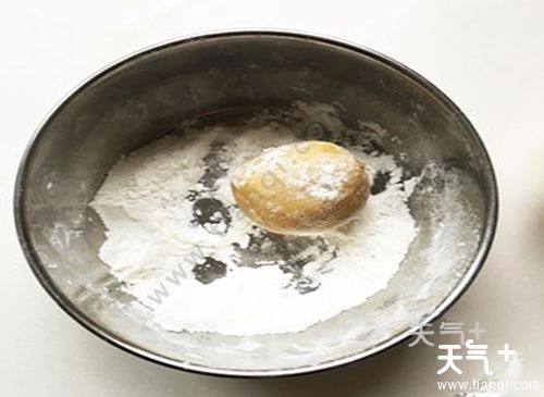 4、把月饼坯搓成圆柱状,扔进玉米淀中滚一下再入模具压制。(也可月饼模具内撒上一些防粘,粉在模具中晃一晃,再将多余的粉倒出)