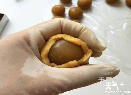 2、制作蛋黃。 取咸蛋黄放在铺了油纸的烤盘上,喷潇高度白洒。(也可将蛋黄在装有白酒的碗中过一下)烤箱180度烤8分钟凉后待用。将饼皮和馅按照3:7比例分好。馅料重35g(包括蛋黄在内的重量)先莲蓉将蛋黄包好,皮15克。(如新手馅可选30g,皮20克)