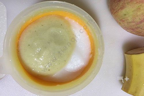 3、取适量亨氏混合水果泥,将它和莲藕片混合在一起;