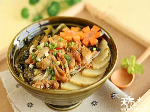 片儿川面是杭州奎元馆的名点,也是杭州的风味小吃。烹调时,选用瘦猪肉片,配以笋片和雪菜,与面条同烧而成。此面肉片鲜嫩,雪菜笋片色泽翠白分明,食之美且爽口。