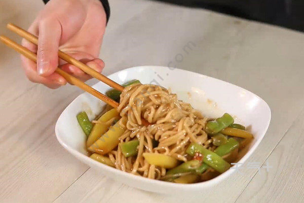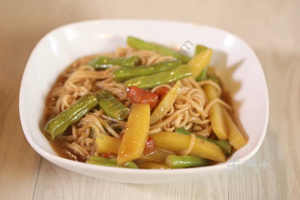 热锅下油,倒入番茄、土豆、四季豆炒至断生.调入生抽、老抽、蚝油拌匀,注入适量清水.调入盐、鸡精拌匀,放入面条,加盖焖煮3分钟即可。