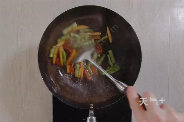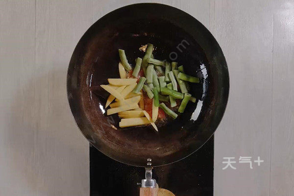 1、热锅下油,倒入番茄、土豆、四季豆炒至断生;
