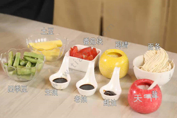 面条1把、四季豆适量、土豆2个、番茄块1碗、鸡精适量,生抽1勺、老抽1勺、耗油1勺、盐少许