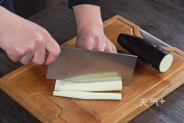 2、茄子洗净去蒂后切长条;