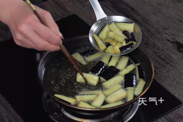 7、平底锅油温6成热,将茄子表面均匀拍上薄薄干粉,放入锅中微炸后捞出备用;