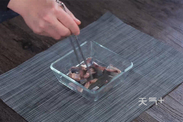 1、咸鱼提前用清水浸泡6小时去除多余盐分,浸泡好的咸鱼,鱼身切小条,加入料酒拌匀腌制20分钟;