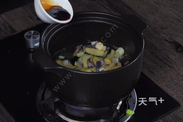 8、炒锅油温6成热,爆香葱、姜、蒜、倒入咸鱼微煸,加入茄子炒匀,倒入砂锅,加清水没过食材一半,调入生抽后加盖;