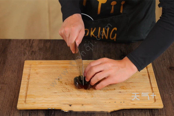 1、皮蛋对半切开后切小块;