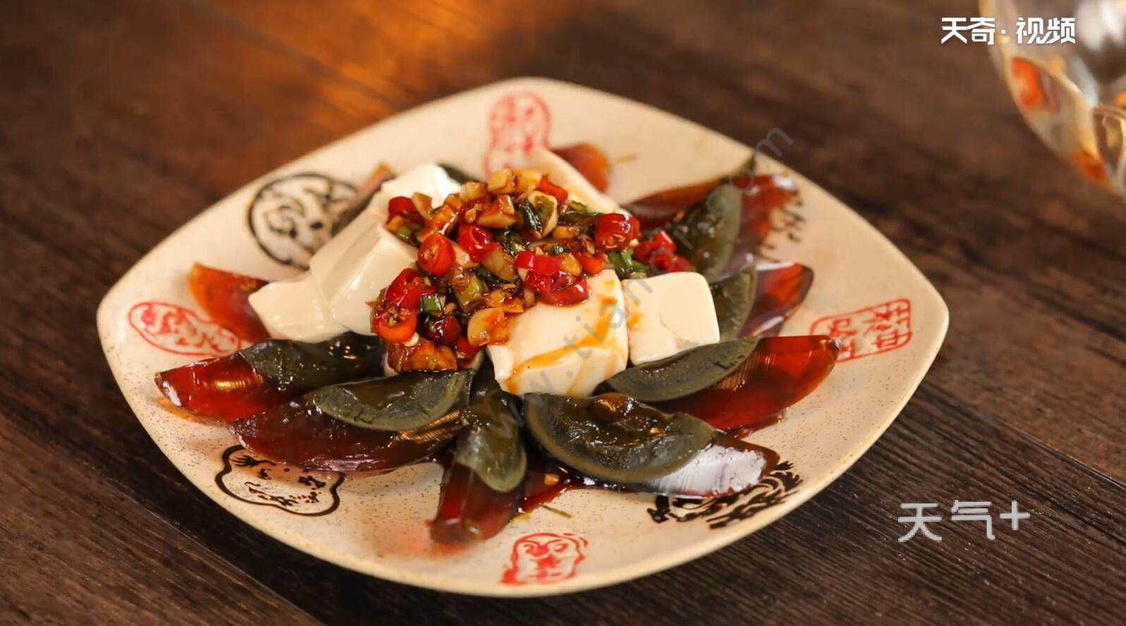 5、将豆腐块堆放到盘子中间,在四周围上切好的皮蛋;