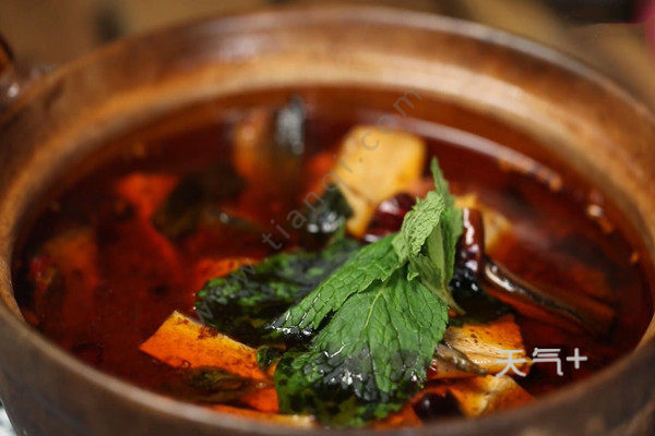 5、调入盐、白糖、鸡精、生抽拌匀,倒入砂锅,淋上炝好的干辣椒油,放上藿香叶即可。