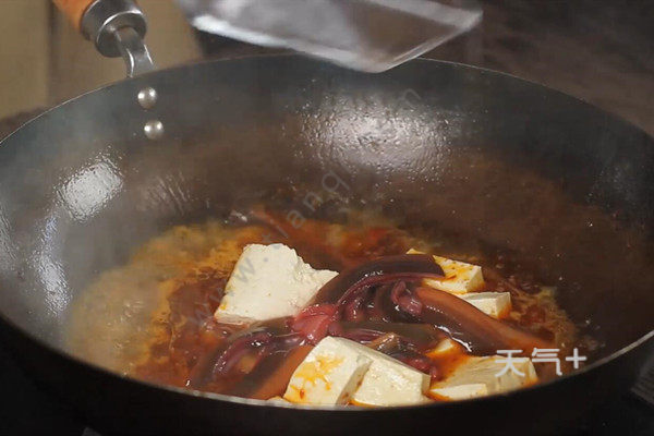 4、热锅下油,下入火锅底料、姜蒜末、五香粉炒香,注入适量清水煮开,倒入豆腐、鳝鱼煮熟;