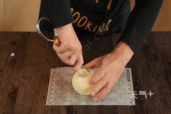 2、将新鲜的雪梨洗净去皮,切去顶部备用,用勺子将中间的核挖空;