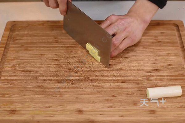 2、姜切片,大葱切粒,蒜切片;