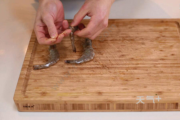 1、鲜虾洗净,用剪刀在虾背部剪开,挑出虾线洗净;