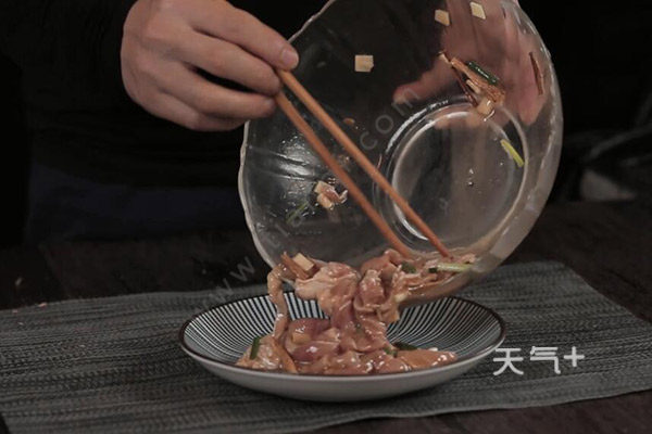 4、将腌制后的鸡腿肉与黄花菜、生抽、耗油、葱段、盐、1汤匙料酒、2片生姜拌匀,加入1汤匙食用油、生粉继续拌匀腌制20分钟,装入盘中;