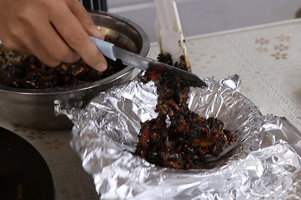 3、等黑芝麻加完以后呈拉丝状态即可起锅入模具;