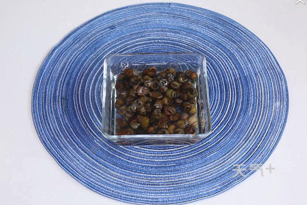 2、田螺里面倒入清水、1勺盐、1勺食用油搅匀,浸泡3小时,刷去表面泥垢,剪掉尾部再次倒入清水浸泡1小时;