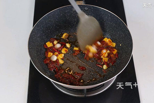 3、倒入适量油,油温5成热,放入1勺豆瓣酱炒出红油,加入青花椒、蒜粒、姜片、干辣椒、葱片翻炒均匀;