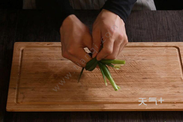 3、小葱取葱头剁成蓉,3根挽成葱结;