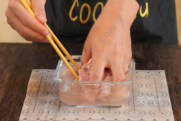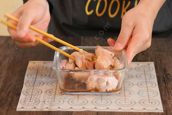 3、排骨中放入盐半勺,胡椒粉1克,蒸鱼豉油半勺,料酒1勺、姜丝拌匀,腌制20分钟;
