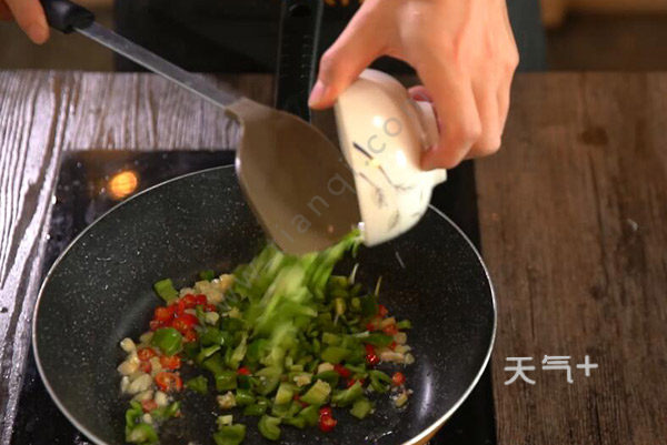 7、锅中留底油,放入姜蒜末炒香,放入青椒小米椒翻炒30秒;