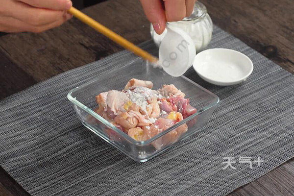 6、鸡块同样加入芡粉、米酒和盐搅拌均匀;